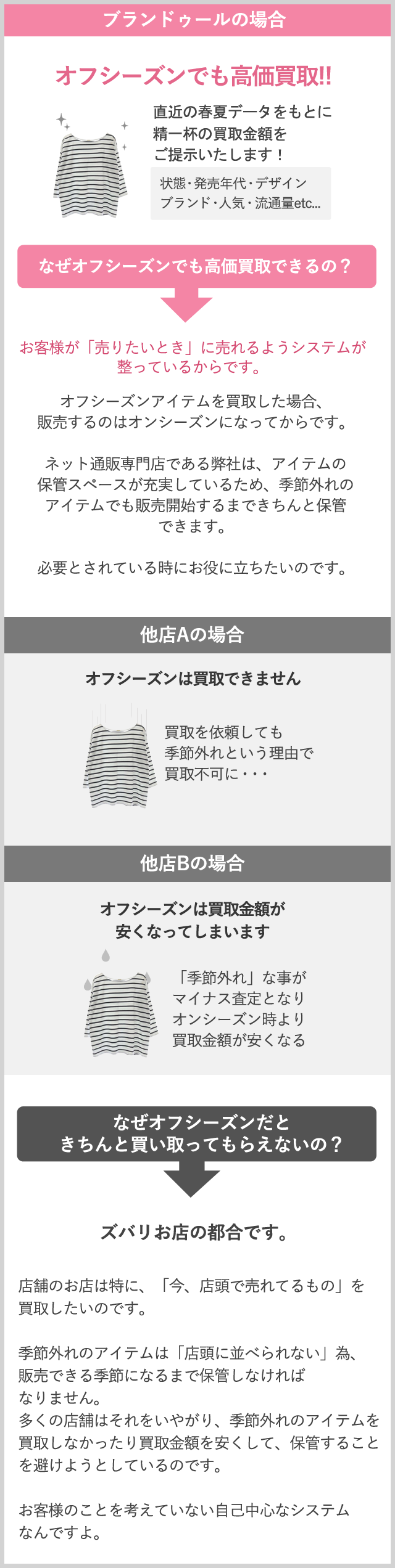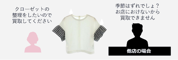 クローゼットの整理をしたいのに、 「オフシーズン物は在庫として持ちたくないから」というお店の都合で買取できなかったり、買取金額が安くなることに納得できますか?